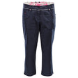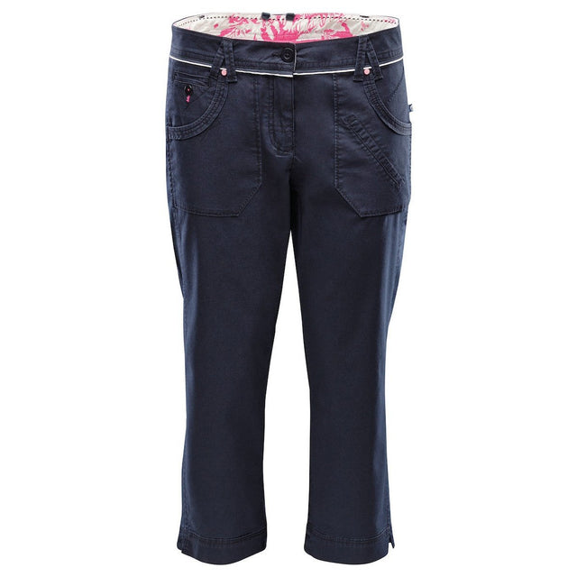 Summer capri in vertical satin strectched fabric. Soft and cosy summer quality. Marinepool logo buttons stiched on in pink contrast yarn. Printed pocket lining and wasitband lining in trendy carribean design. Multi colour pipings at waistline. Marinepool boat embroidery at backside, placed over pocket flap. Fashionable used rivet details at pocket entries. Feminine figure skimming shape. Capri in 5 pocket style. Pocket flaps with garage as fashionable detail at backside. Backside waistband with maritime tape detail as decoration. Zig-zag stitching and elaborate pattern lines as design detail. Elaborate Marinepool leather logo badge on backside waistband. Small figured shape.