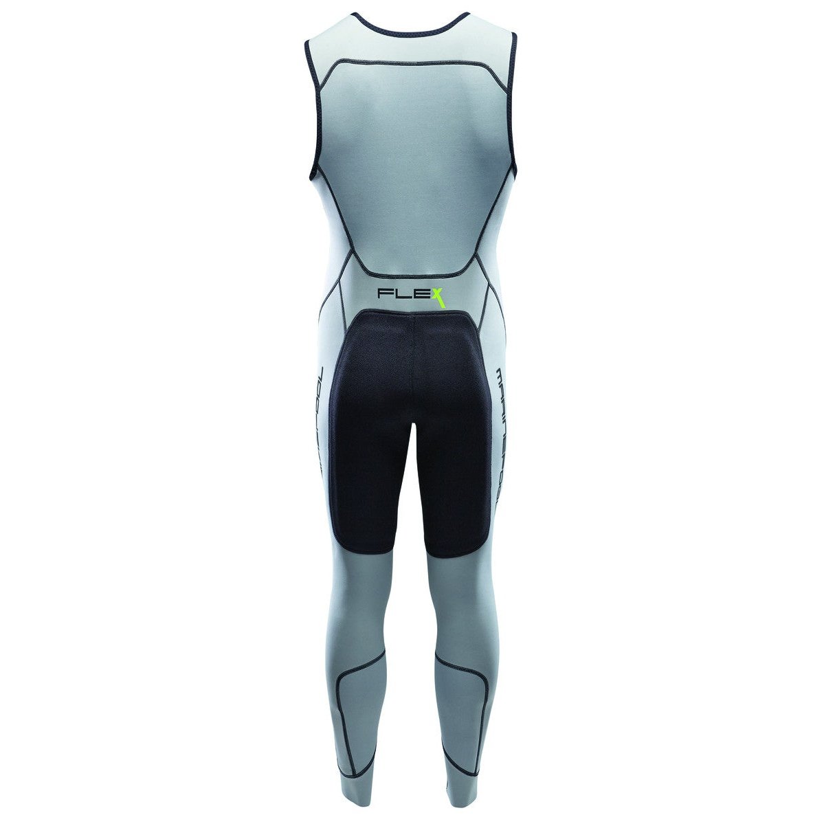 1 mm, nylon double lined, super stretch neoprene, flow cut, shoulder strap opening for quick and uncomplicated donning, supratex reinforcement at knee and seat area, inner knees and seat area reinforced with extra patches, leg cuff seals, front fly