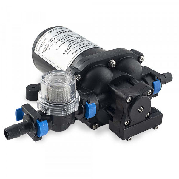 Water pressure pump 24V with capacity 13,2l/min (3,5GPM). For continous supply of pressurized water on demand. Cut off pressure 2,8 bar (40 psi). Extra heavy duty sealed pressure switch, smooth and pulsation free flow, quiet operation. Serve up to 3 outlets. Easy to install with quick connect ports for 1/2" hose, inlet strainer 40 mesh included. Fuse size 5A. Interchangeable with Jabsco 31395-0394, Johnson Pump 10-13405-04, 10-13395-04, 10-24604-04