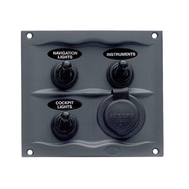 Injection moulded plastic panel with high quality two position switches rated to 20 amp, covered by rubber boots and a cigarette lighter type power socket rated to 16 amp. Panel is splash proof to IP56 standard from the front face. Each pair of toggle switch/power socket is connected to a behind panel mounted AF type blade fuse holder (115714). Available in 3 or 5 gang versions with a choice of grey or white facia. Supplied complete with 113714 28 piece label set (refer page 218). Power plug is not included with the panel and is available as a separate part. Now supplied with Marinco power socket.