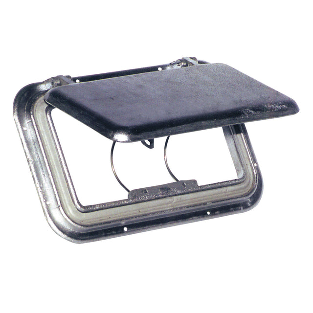 Cast alloy, plain finish scuppers that allow high volume of water transfer for self draining decks, cockpits and similar. Surface mount. Screw on or weld onto alloy boats. Retrieval attachment point fitted. Stainless steel tension spring mechanism locks in open as well as closed position.