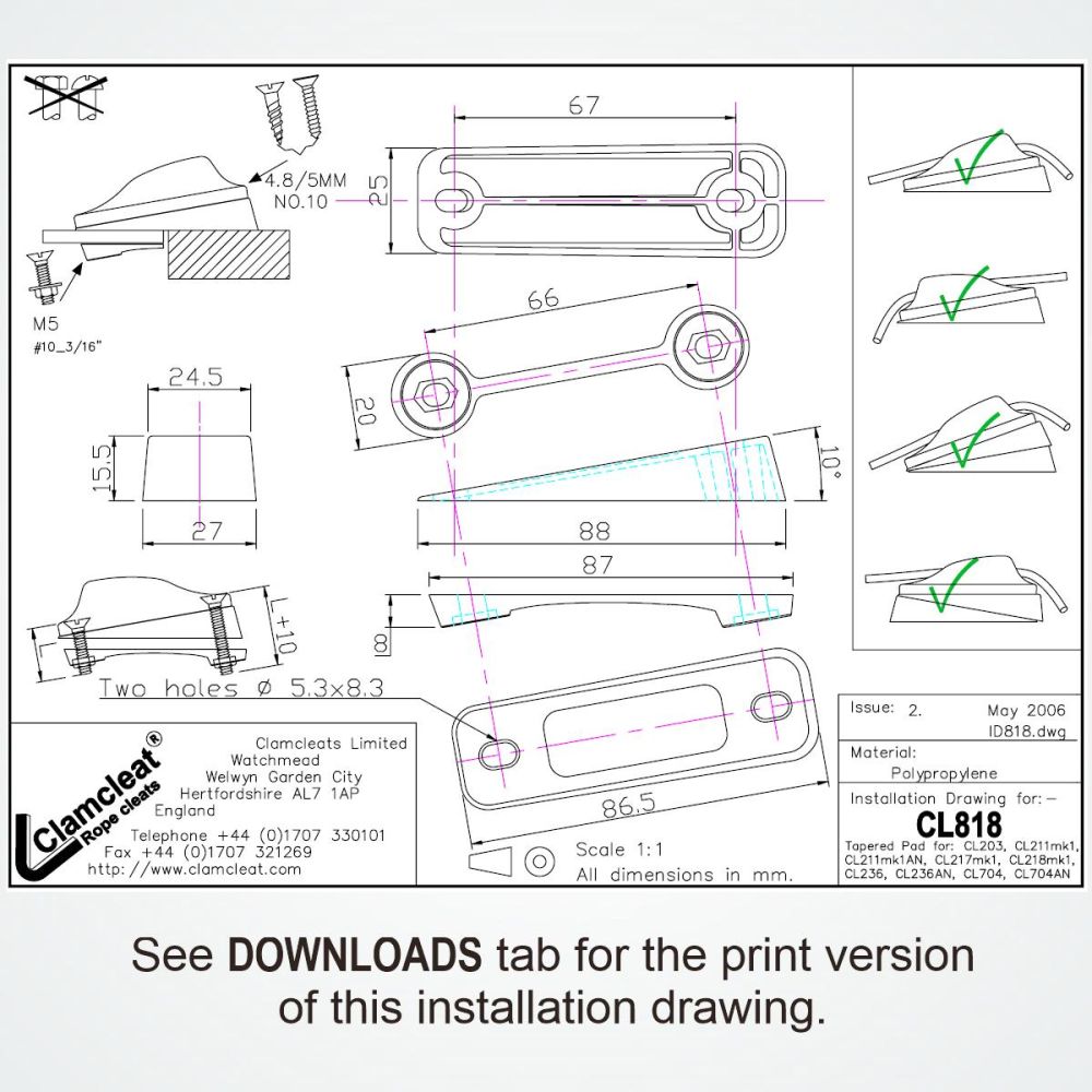 The Clamcleat® CL818 Tapered Pad aids correct rope/cleating alignment. It can allow tensioning without rubbing the rope over the cleat teeth. Can be mounted either way round. Backplate provides under deck support when bolting through thin sections and is supplied with every pad.