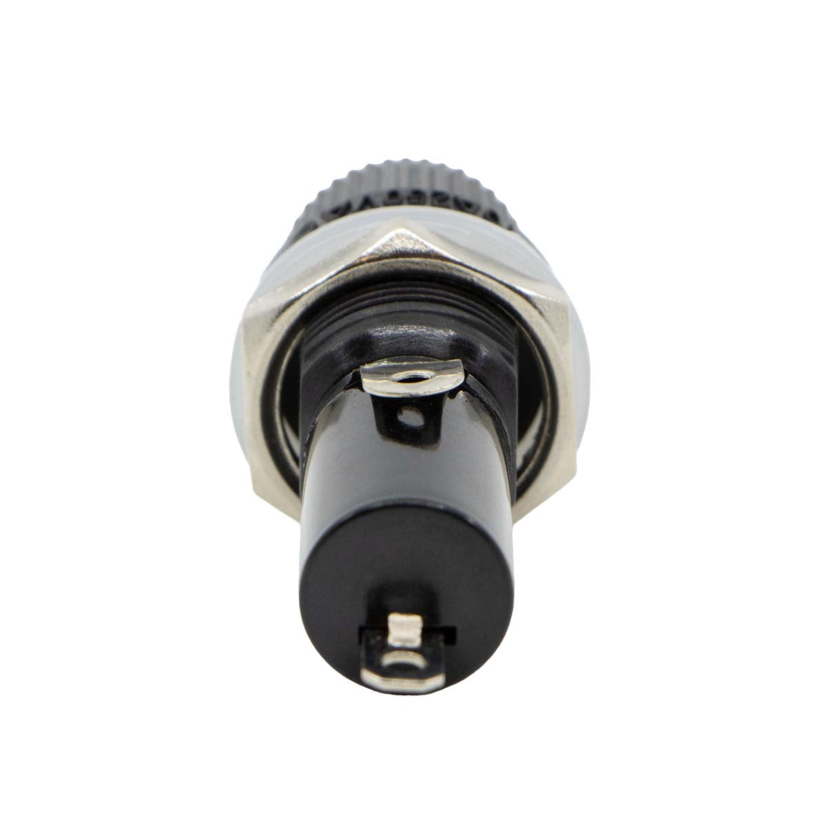 Panel mount, round screw cap, spring loaded fuse holder. Suits 32 x 6mm (3ag) glass fuses. 12/24 volt, 10 amp maximum. Fuses not included.