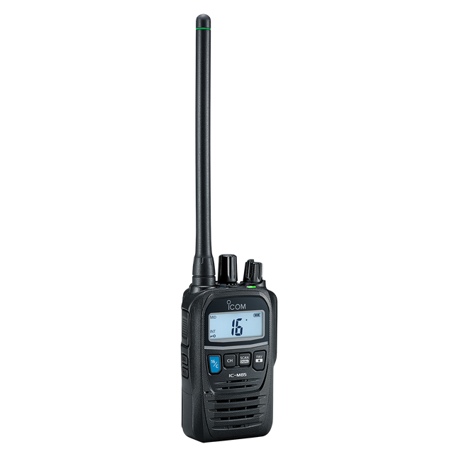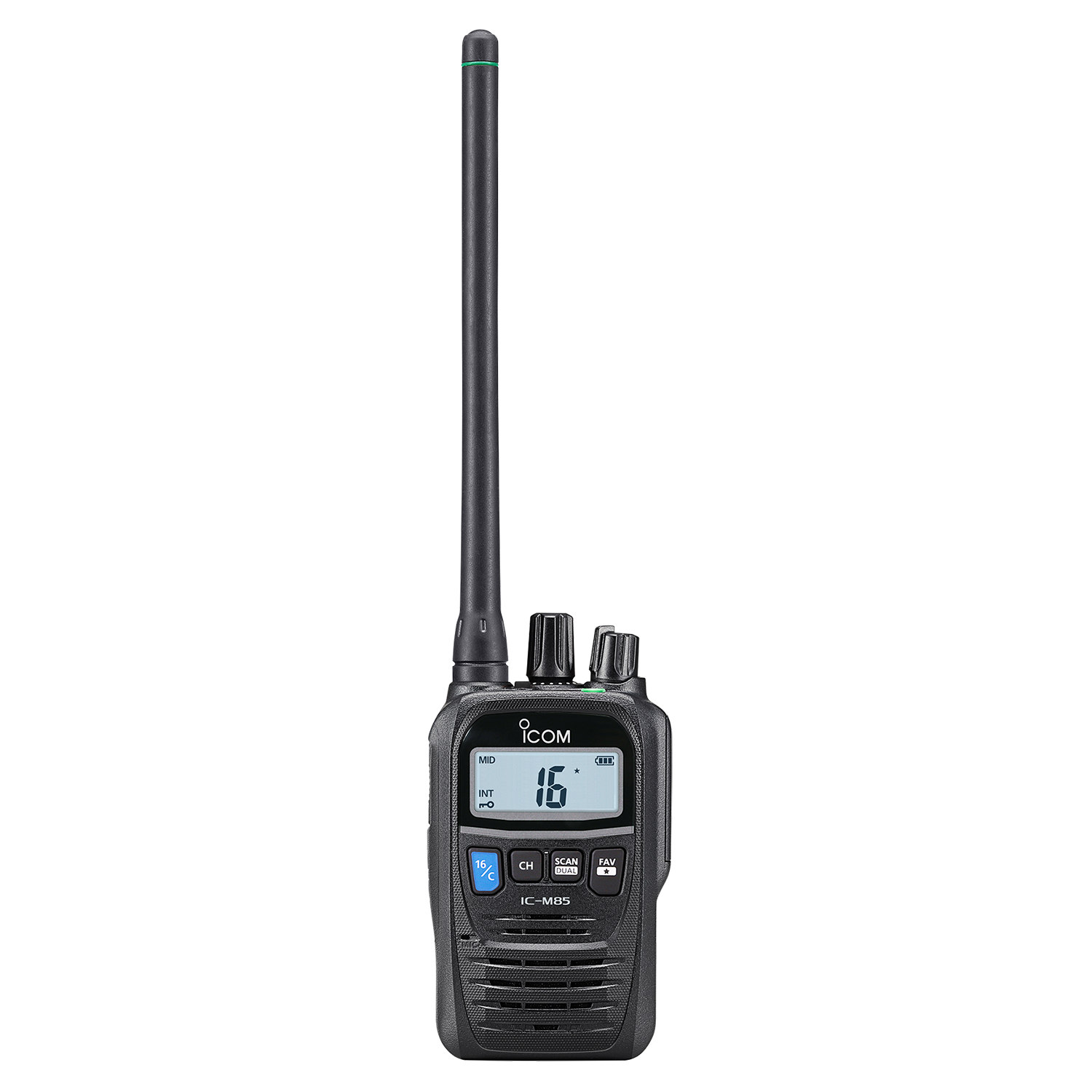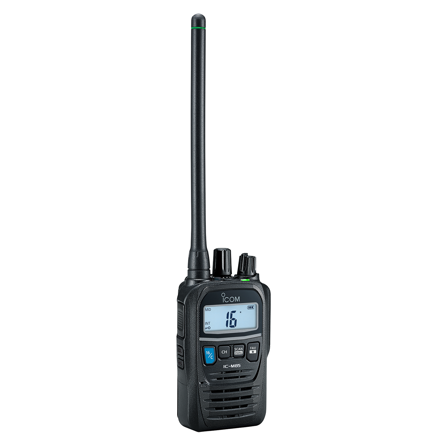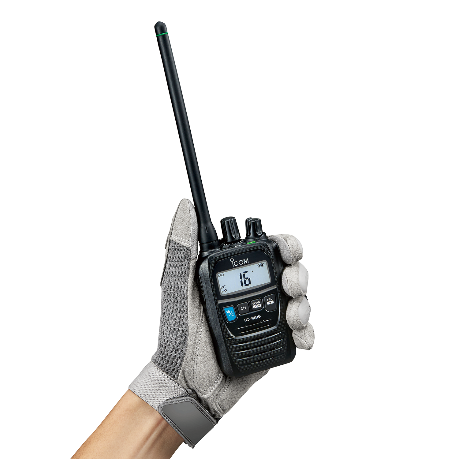 The IC-M85E is the most compact (W×H×D: 56 × 92 × 36.2 mm) and lightweight (weight: 281 g (with BP-294, FA-SC58V and MBB-3)) commercial grade marine and land mobile hybrid radio in the world*.