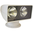 Powerful 200,000 candlepower dual halogen sealed beams in a stylish weather resistant non-corrosive thermocast housing with tough polyurethane finish. Motorized clutch and gears allow full 360 deg rotation and 60 deg vertical sweep.
