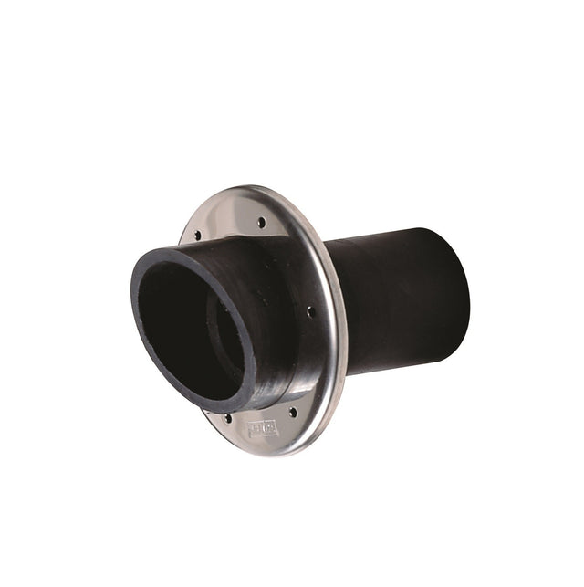 Transom exhaust connection in EPDM rubber with high gloss polished stainless steel mounting ring. Can be mounted to the transom easily and flexibly.