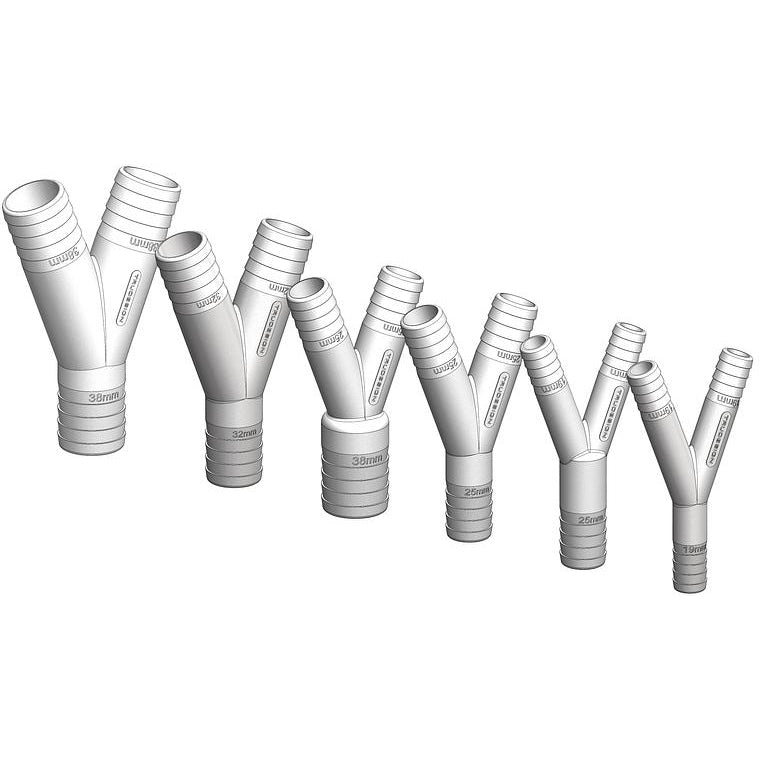 Tru-Design Y Pieces eliminate the corrosion and electrical bonding problems associated with metallic fittings. The Y Pieces are designed for twin hose clamps, and to not crush under high load conditions.