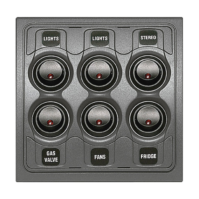 Injection moulded plastic panel with contoured design includes six simple two position rocker switches and individual ATC fuses for each circuit. ATC fuses are accessible from the front cover. Square Dimensions allow for modular mounting of multiple panels in vertical or horizontal configuration. Each switch Features an integral system on red LED and is rated to 16 amps. Suitable for 12 volt power supply only. Supplied standard with 113715, 24 piece label set ). Symbol label set, 113716 is also available. The panel is not waterproof and should be used in interior applications only.