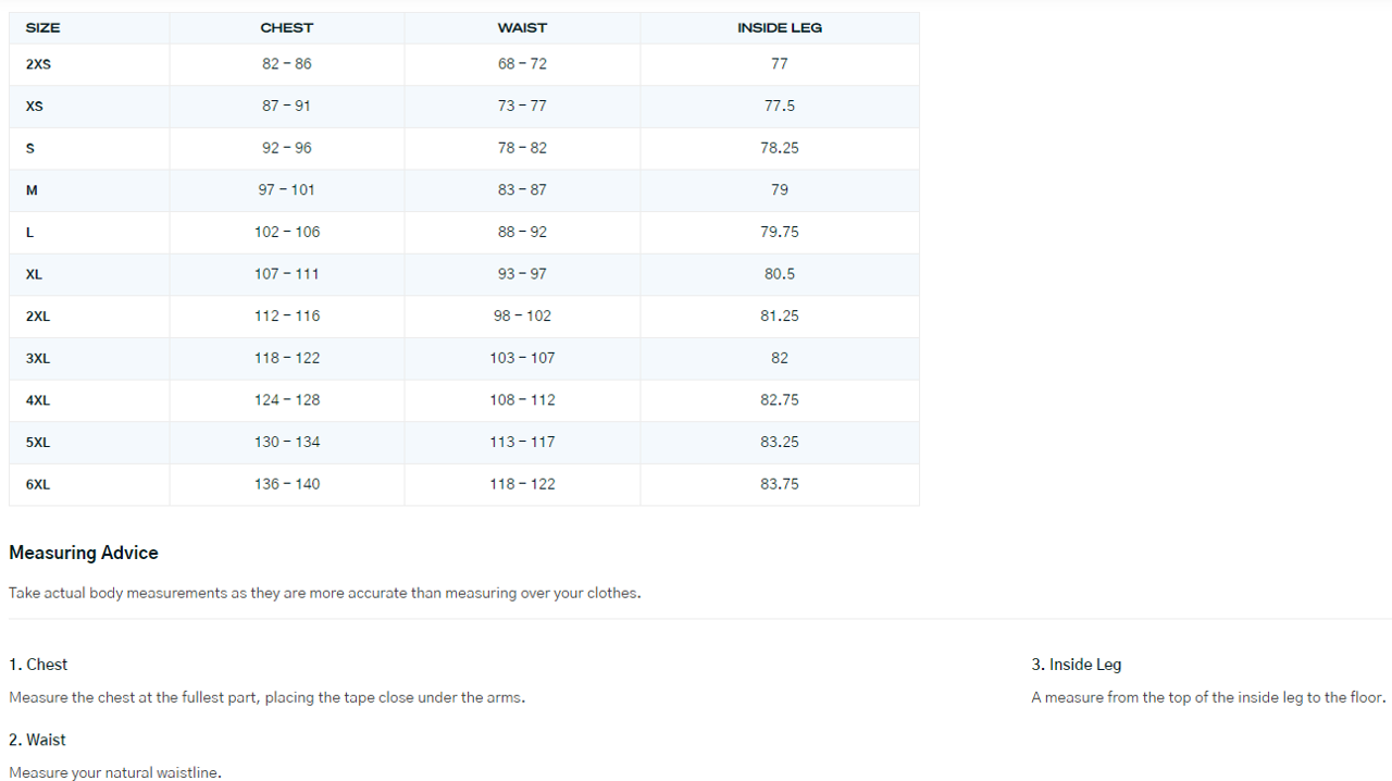 SIZE | CHEST | WAIST | INSIDE LEG |