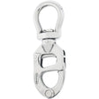 High strength-to-weight ratio stainless steel trigger release snap shackle with large swivel bail.