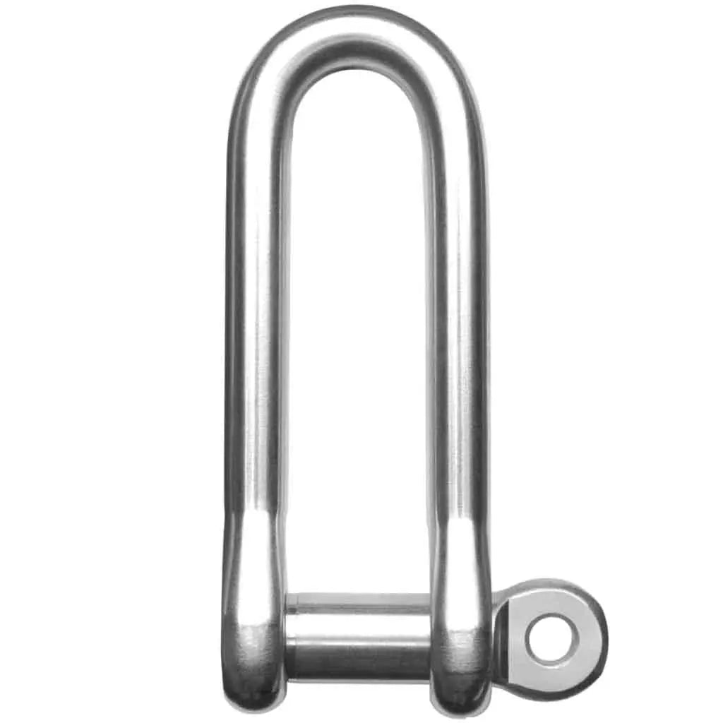 Grade 316 stainless steel Long D shackle, 1/2" diameter pin with a coined shackle pin head and seizing wire hole.