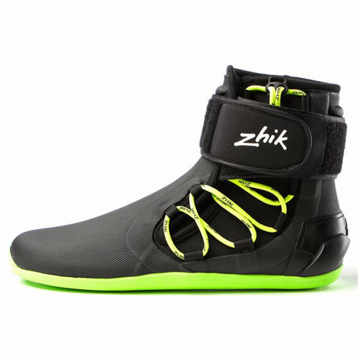 An evolution of the original and best-selling Zhik dinghy boot the latest high cut boot is a true realisation of everything Zhik has learnt from working with some of the world’s greatest sailors. An identity is imparted using a high grip non-marking flouro yellow sole and lacing while the moulded upper, heel cup and oversized ankle strap provide excellent support during periods of high activity. Improvements over the original include a quick lock lacing system, low profile ankle strap, reinforced mid sole and improved shape for a firmer and closer fit that minimises chafing and provides even more support. The 2mm neoprene construction combined with the lacing system allow the boot to work through all seasons as the fit of the entire boot can be tailored to a neoprene sock however, being 2mm this boot is lighter weight and has a slimmed down sole (without reducing tread depth) to maximise feedback and connect you more directly to the boat.
